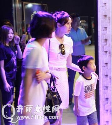 当日胡静身穿白色t恤和短裙,搭配白色运动鞋,一身干净清爽的打扮,使胡静青春气息十足。儿子牛魔王乖巧地牵着妈妈的手跟在身边。高颜值母子走在路上十分亮眼。