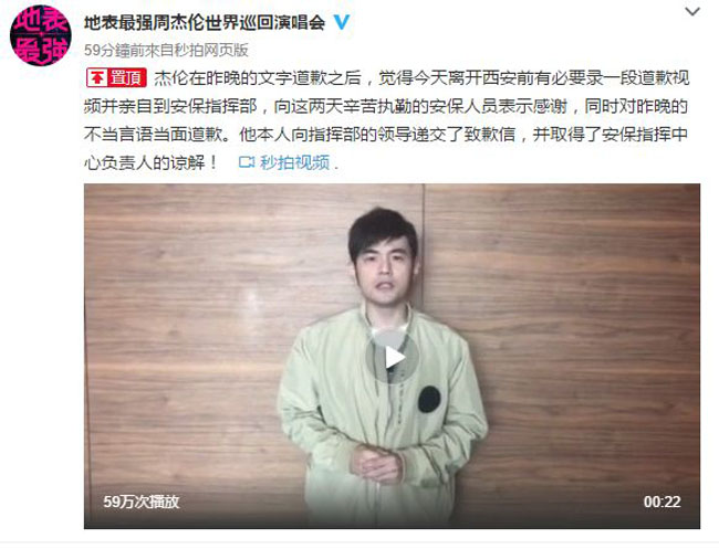 周杰伦通过官博对那个安保人员道歉,说自己太激动了没有了解到事情的情况就大吼,事后感到非常后悔这么没有礼貌的对待工作人员。据悉,西安演唱会现场并未请有保安,现场的都是武警部队。