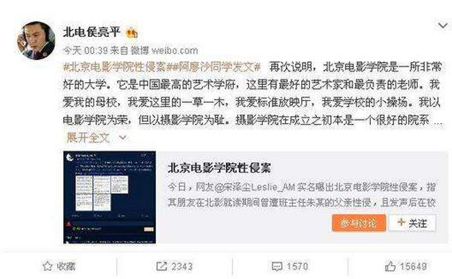 近日一名自称是北电学生的网友在微博上开设为@北电侯亮平的账号,实名举报北电摄影学院以宋靖、吴毅为首的教授们多次潜规则女大学生,常年贪污受贿的事实引社会大众关注。对于“北电学生实名举报”一事,北京电影学院发出公告,称学校对此高度重视,已经责成纪检等相关部门依法依规进行调查处理。